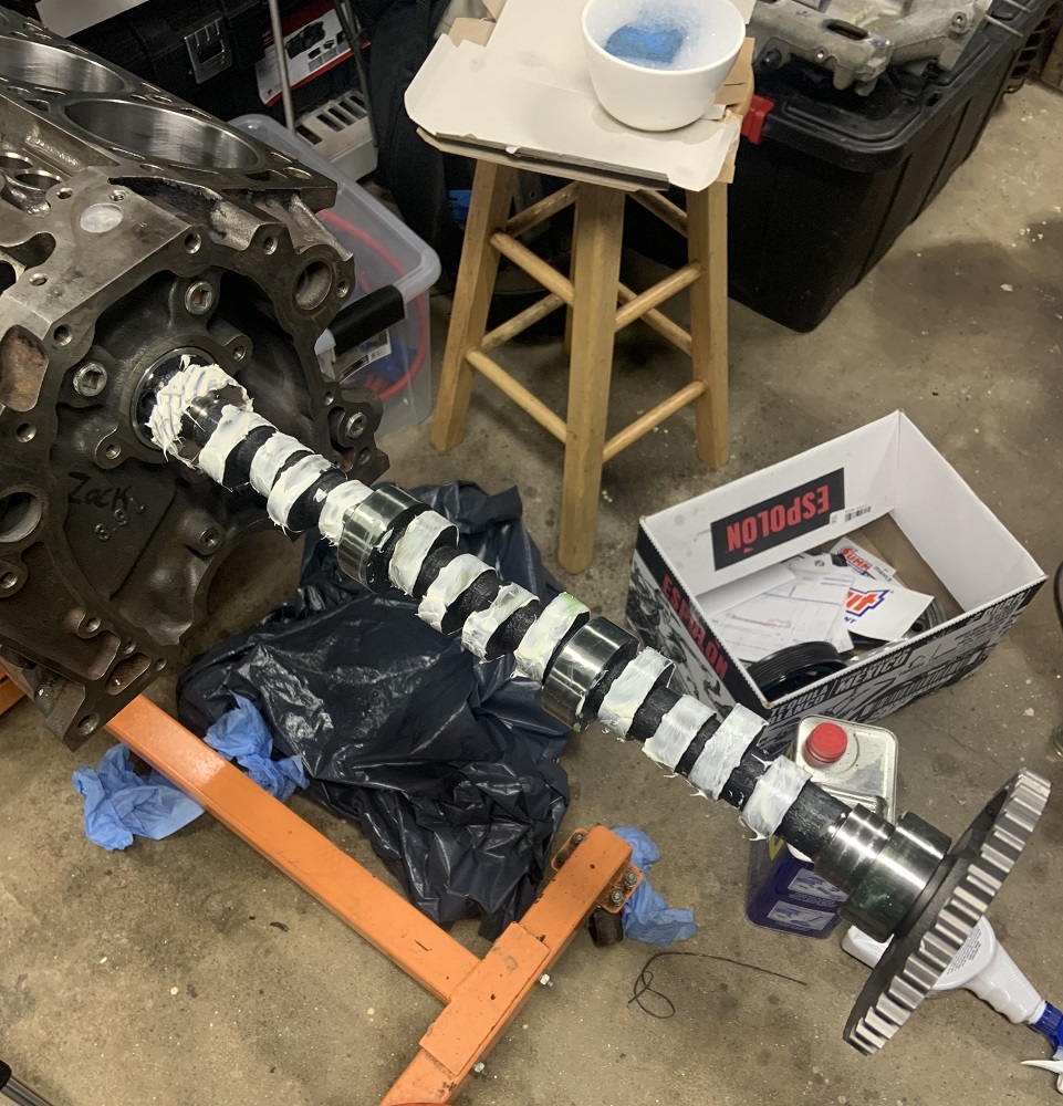 Time to install the cam. I wiped it clean and then coated the journals in assembly lube, and the lobes with a Comp Cams valvetrain assembly paste. I thought I would be able to use the paste on the whole motor, but doing a little research it seems it is just for valvetrain. I installed the thrust plate as well.