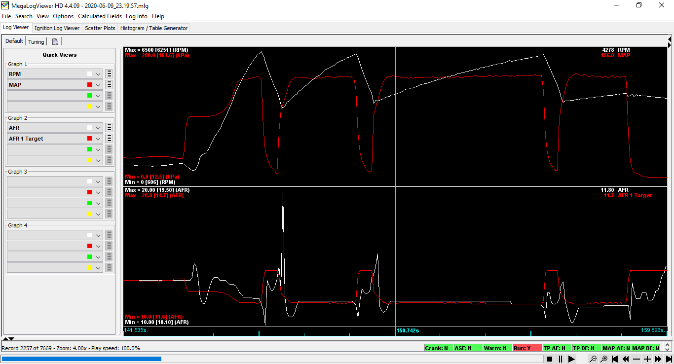 In the bottom pane, the measured AFR and AFR target are superimposed on each other.