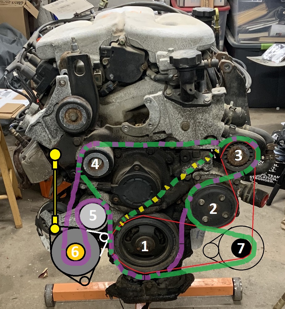 I may replace pulley 4 with an automatic tensioner if I go purple route. I would put the pivot point right above the alternator. I could revert back to the initial red routing and tension that statically between pulley 1 and 7, or even put the stock tensioner there if I can fit it. We will see, I kinda doubt I will ever have AC in this thing, I don't know if its worth making my life more difficult now for a possibility that would require a ton of modification anyways.