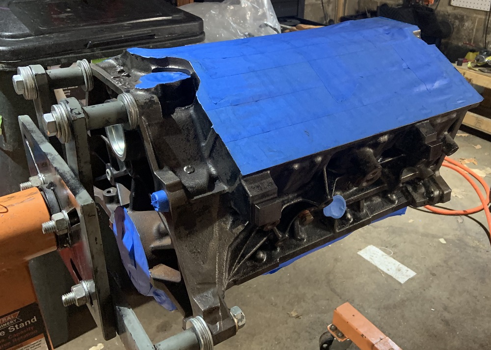 And finally I wanted to spray the block to paint it instead of brush the paint on, and I wanted to give a final sprayed coating to all of the parts I had already painted to get a more metallic finish. I was going to assemble everything and paint it all together instead of masking things off, but I still had to prep the block with an Eastwood rust converter so I had to end up taping the block off anyways for that. It was weird, it was sprayed out of a regular spray bottle where the trigger pumps the contents, but it was basically paint. It came out blue and dried black on the block. I sprayed one coat on the block and did not like the finish so I brushed it smooth, and then did a light second coat that I brushed on. It dried black but I have to wait 48 hours before I can top coat it, hopefully this weekend. My brother used to work at an autobody shop in highschool and he gave me a good tip for masking parts, which was to use a breakaway style razor blade so that when it dulls quickly and starts to tear the tape instead of slice it, you can just break the tip off and have a fresh razor again. Taping went much faster than when I taped all the other engine components.