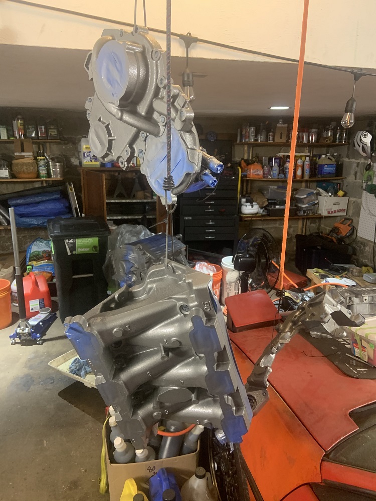 Little update from yesterday, got the painting of motor parts complete. I shot the paint out of an HVLP gun to paint the block as well as repaint the timing cover, coolant crossover, LIM, and oil filter adapter.