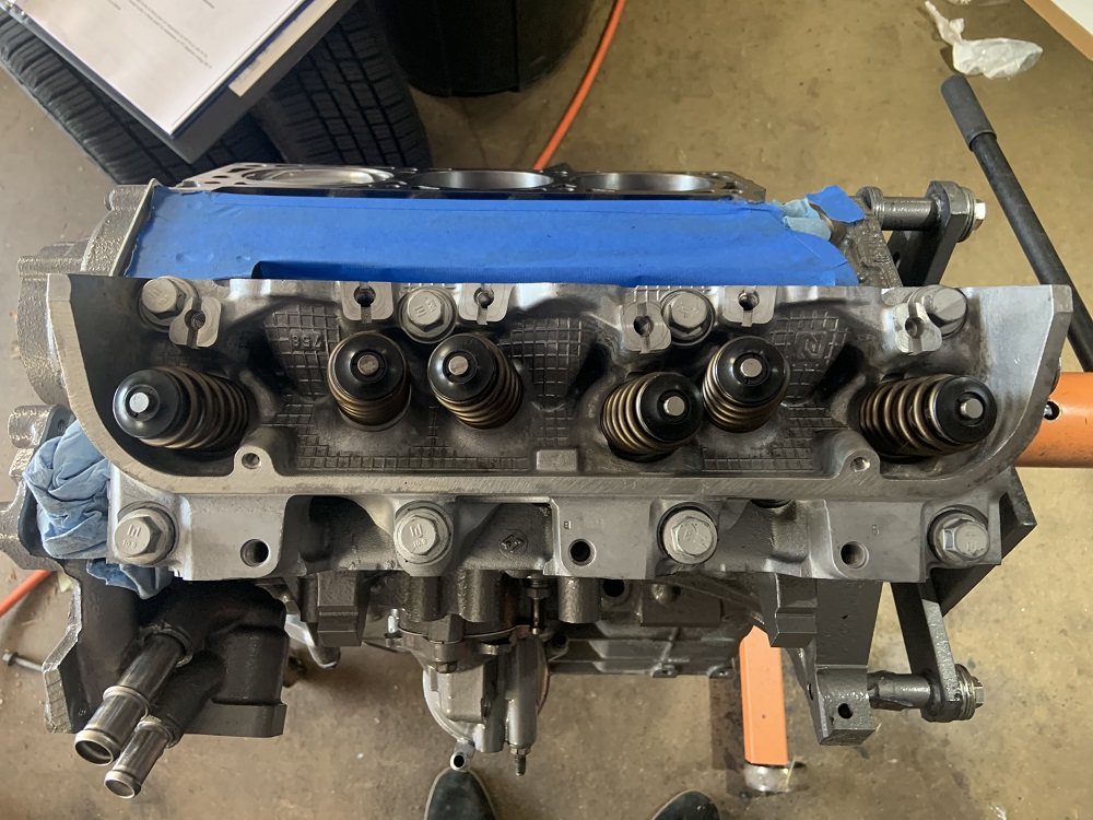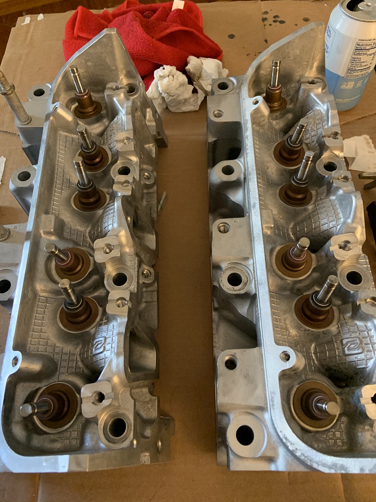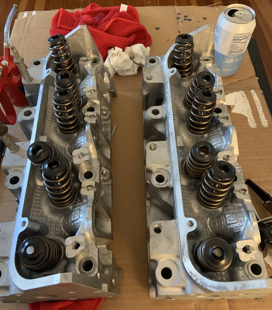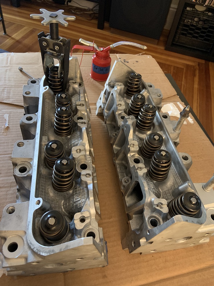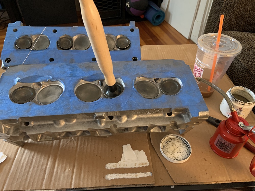 I washed the heads thoroughly, and cleaned out the valve guides with a little cylindrical brush and rubbing alcohol. I tossed them in the oven on the lowest setting with the door cracked until they were nice and hot to the touch to make sure all the water evaporated from the cleaning process. Then I decided to re-lap all the valves as all the porting, metal dust, and sandpapering probably affected the sealing surface of the valves. I assembled the heads with the PAC spring, keepers, and retainers.