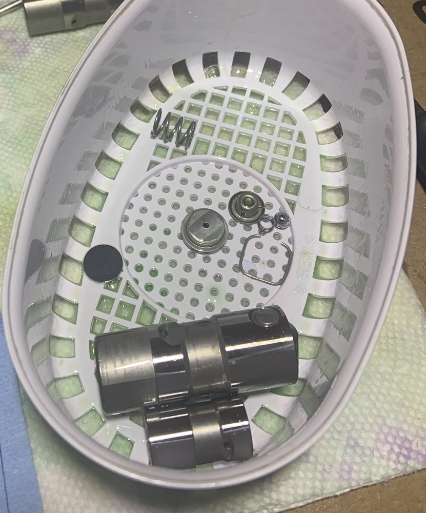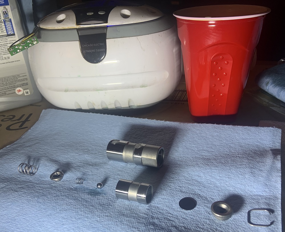 I spent some time disassembling all the new lifters that I bought, they were a little dirty so I figured I would take them apart one by one, run them through the ultrasonic parts cleaner a few times in some Simple Green, then oil them and put them back together. They have been sitting submerged in a container of oil for days. A lot of particulate came off in the ultrasonic parts cleaner, I am glad I spent the time to do this, it took many hours. A good tip for taking them apart and reassembling is to use an allen key or drill bit etc to depress the little ball check valve, it allows the body to slide out of the housing easily, and same thing when assembling and trying to get the clip into place, depressing the check valve allows the body to slide fully into the housing.
