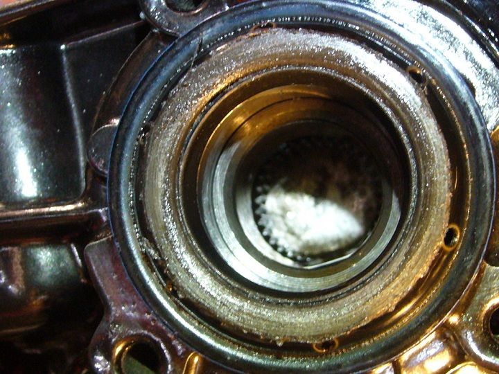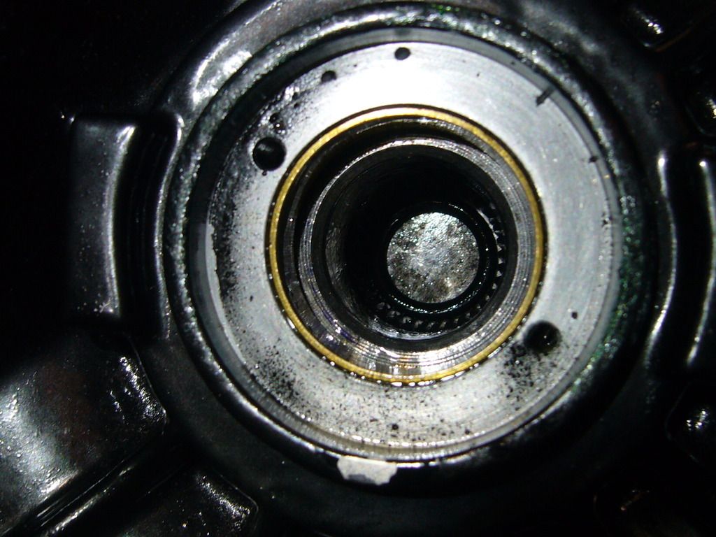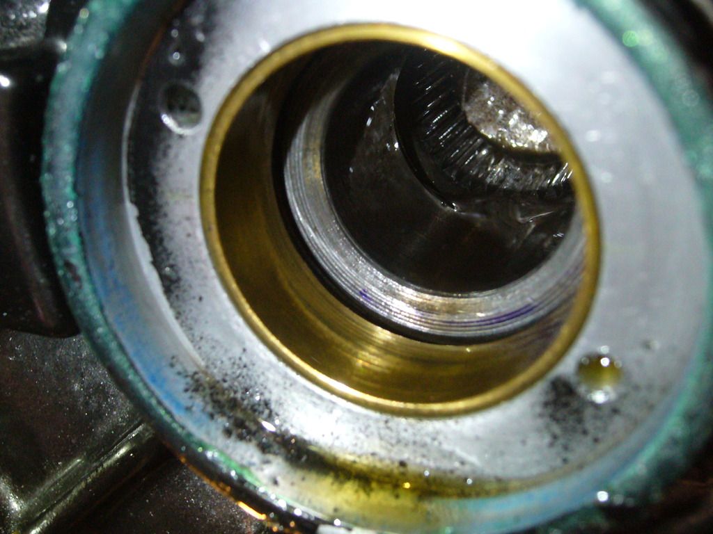 I think that the gold colored metal particles in the transmission oil are coming from this weak bronze support bearing (drivers side in my case). Maybe this wear is normal for this type of support bearing (bearing break-in).