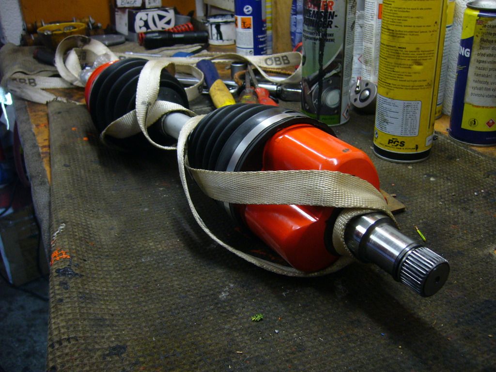 In order to shorten the drive shaft length a few millimeters, I just loosened the small CV-joint boot clamps (inner ones), pulled the boot ends approx. 5 – 10 mm inwards and squeezed them to get all the air out and tightened the clamps again (this will reduce axial force a bit).