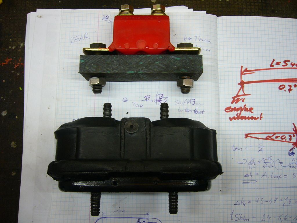 The spacer plate thickness was adjusted to level the engine/tranny perfectly horizontal with the shorter ´79 Dodge Ram tranny mounts in place (which were installed last year):