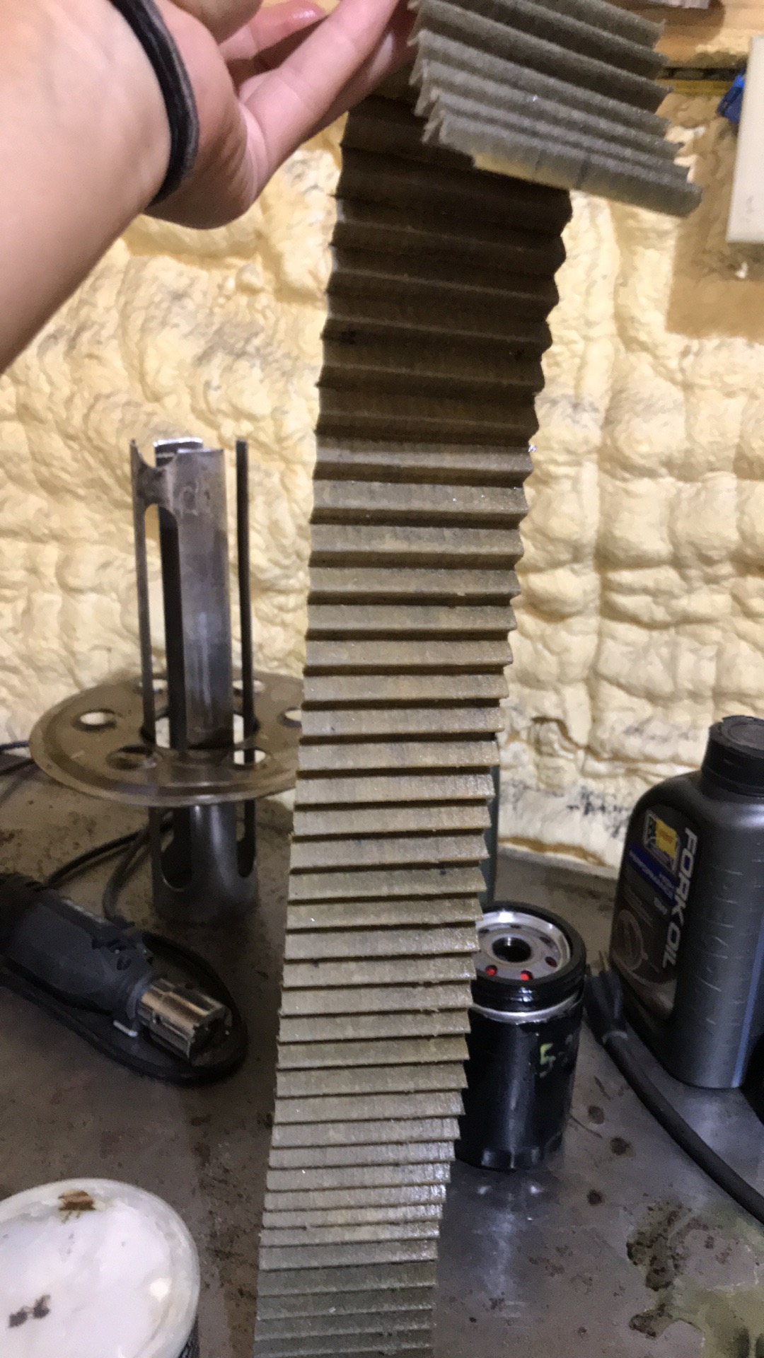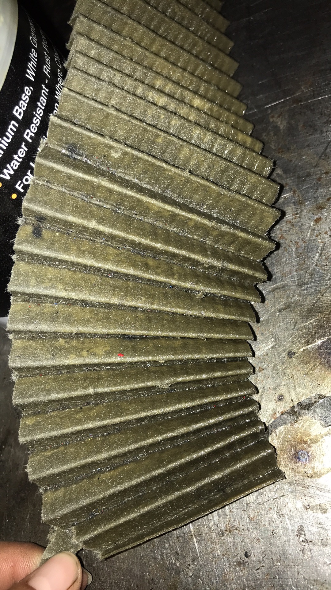 New filter on, and ran the engine. Cracked this filter. We peeled apart every groove, and only found two flakes. The first filter must have all been residual that never got flushed out. Mr. Eric gave the car a clean bill of health.