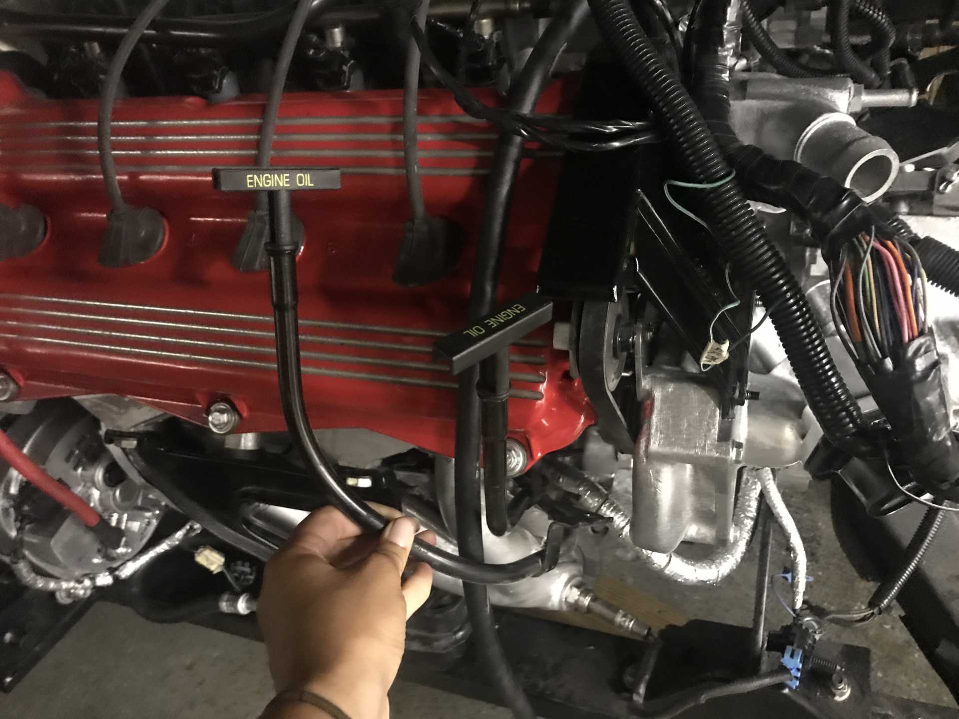 We had to bring the car off the engine a couple of times due to clearance issues. The dipstick was hitting the wall(I image this is how it got bent in the first place), so with some heat we bent it out of the way.
