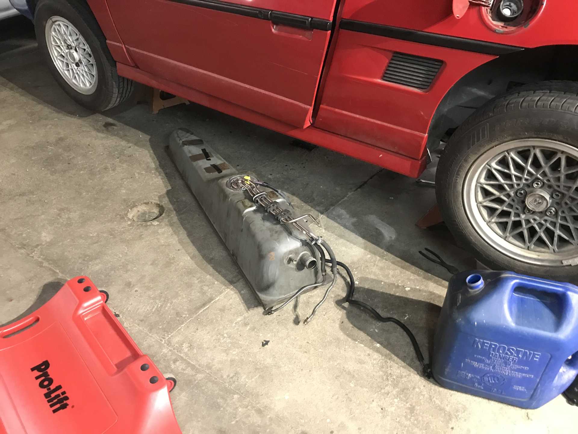 On Sunday, Paul was over and we were doing work on the garage and organizing. A local Fiero friend, Bo, messaged me that day saying he got an ‘87 parts car and would sell the tank. I tried not to get my hopes up because a parts car tank could likely be bad. After he sent me some pictures, I realized it was in fact clean. Paul and I drove the whole 15 minutes away and picked up this tank. It was already sprayed black, so we just touched up a few spot. I just wanted to install it and did not want to bother sanding it to make it a smooth finish.