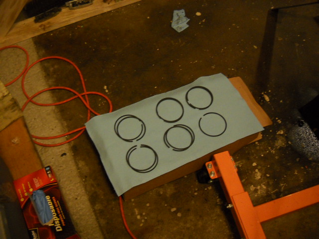 Piston rings organized as I checked them in the cylinders. A few had too small of a gap so I mounted some sandpaper to a piece of flat stock and sanded them down ever so slightly.