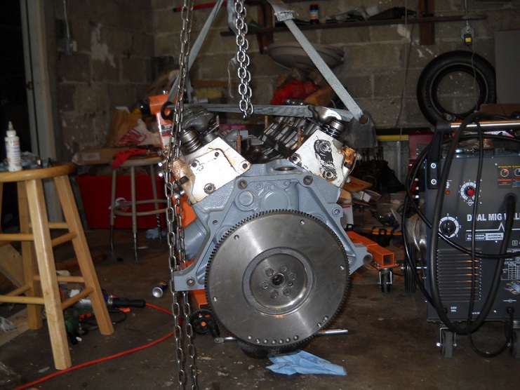 I thought I got more pictures of the actual engine assembly, I plastigauged everything to make sure it was in tolerance, got a new oil pump and pickup tube. I am stupid however and just did not do a great job installing the pickup tube so I am going to take the engine back out to redo that, and redo putting on the timing cover with a sealer instead of just a gasket, and I am annoyed but whatever I am going to make a brand new engine assembly perfect and nothing less. Anyways, new flywheel and heads mounted, heads came back off for porting, I just used them to pick up the engine.