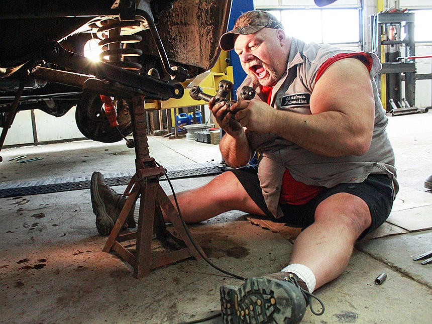 I actually have a 6 foot breaker PIPE that I use...and then, I use a floor jack to lift the end of the pipe to rotate the socket...Also may be helpful to throw a french dictionary at it......