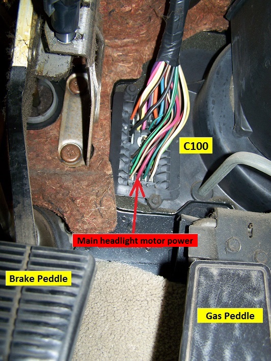 The C100 connector- especially the Red Headlight motor main power wire- is more easily accessed on the inside....and of course this makes it very easy to find keyed power...