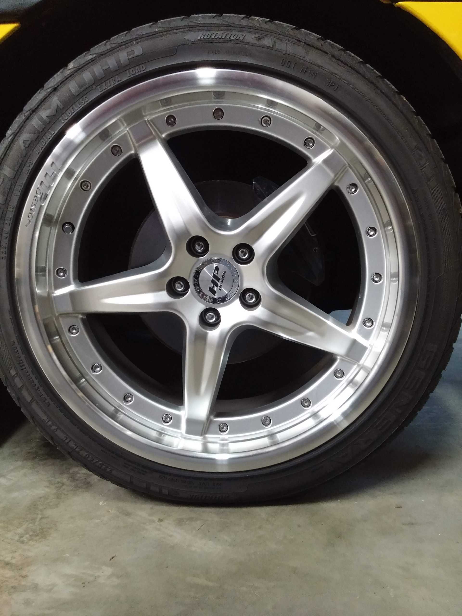 I knew I wanted those wheels and began looking. The turned out to be HP Design Wheels HPR5. When I bought them back on 2008 I was told they had been discontinued. I managed to find a couple sets (I have 2 Fieros). I do not know the wheel specs except to say they are 18". All 4 tires are 225/40 ZR18.