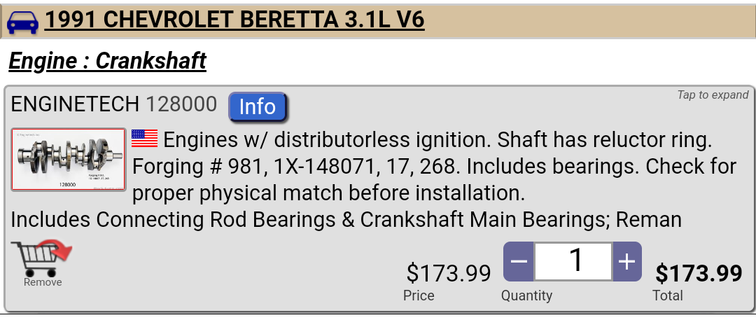I see a crankshaft kit on AutoZone's website (with bearings) for about $205. Link: https://www.autozone.com/in...0540/212889_187284_0 RockAuto sells the same thing, but it appears to be out of stock. You may be able to find it elsewhere, but I got lazy.  [This message has been edited by Blacktree (edited 07-07-2020).]