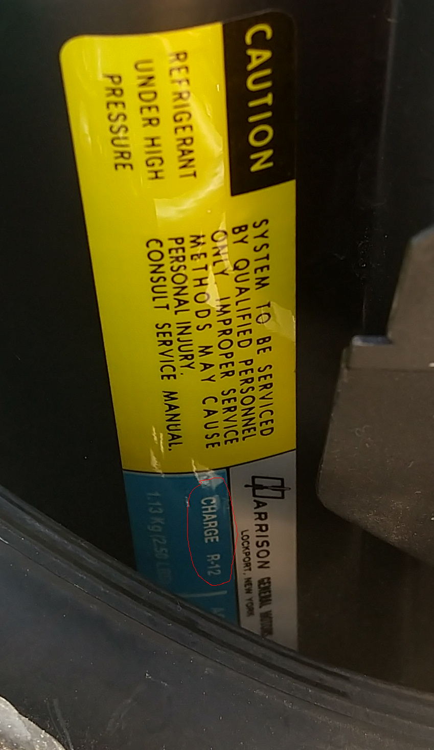 1) Is this system set up for R12? How can I be sure? The accumulator has, what I've been led to believe are R12 type fittings (Shrader valves) and there's a sticker with "R-12" on it: