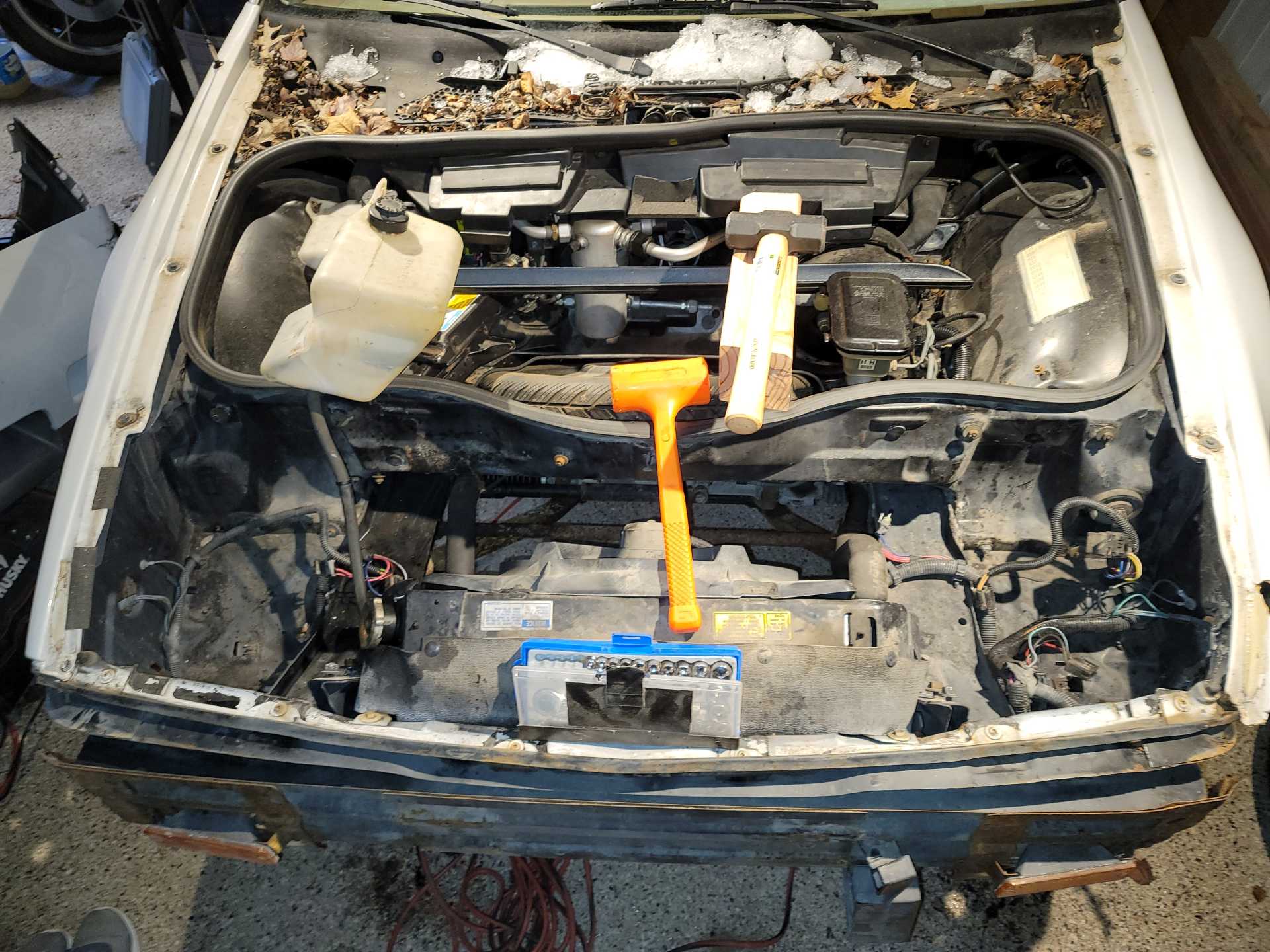 It was me with a 2-3 ft section of 2x4 and 4x4 swapping up also using a 3lb and 5lb sledge beating the ever living Shrek out of it trying to march up the passenger side as far as mounting points. The big part for me (see my 88gt in my sig) my hinge support was compromised so i had to do a bunch of welding to fix that. U finally got to the point where i put everything on for a dry fit. I now know my drivers fender rail needs to come up by about 1/4" or i need to body shim it.