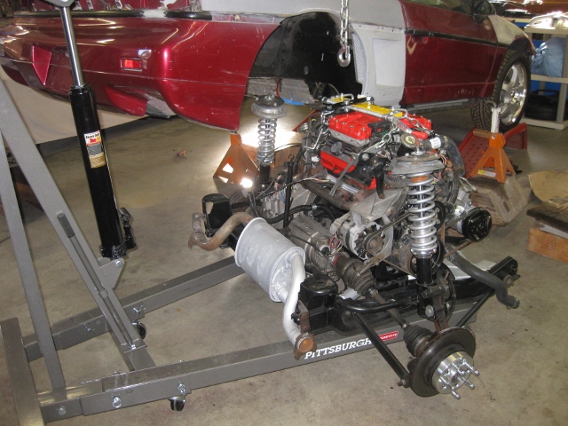 First off, I screwed together a pallet specifically to support the cradle/engine/trans, then after jacking up and supporting the car I used the engine hoist to lower the assembly out of the car onto the pallet; This way allows access to the cradle bolts, whereas lowering the whole car down onto the pallet makes it difficult to get to those bolts. And you need a heavy duty hoist to lift the car anyway....So why not lower the assembly down out of the car?