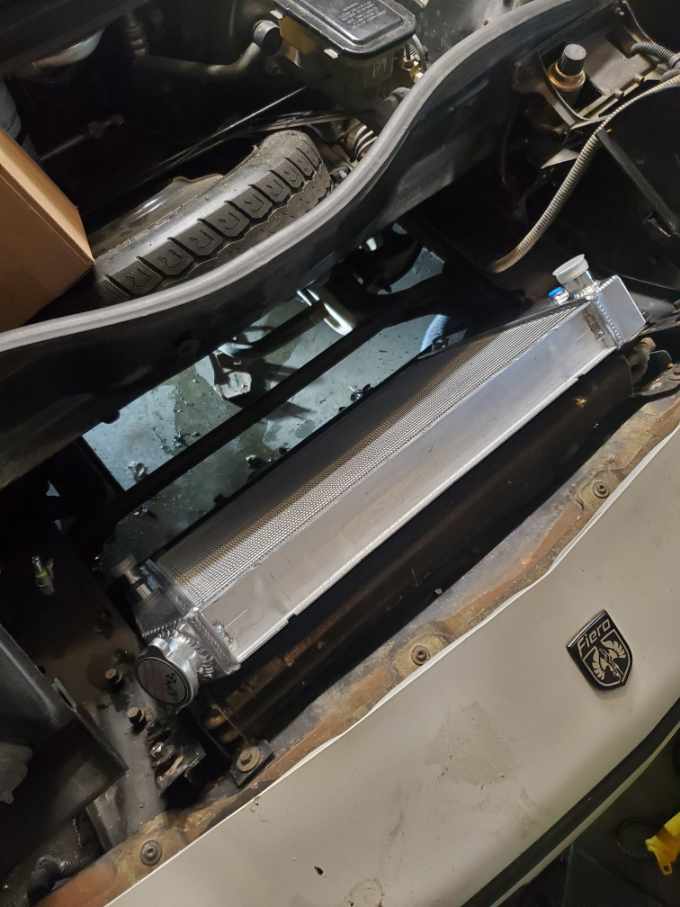 And putting the new radiator in place. I'm super tempted to replace the AC condenser at this point but don't feel like spending the $300 on it yet so I'm going to hold off. Once the SS mig wire comes in, I'll go ahead with finishing cutting the coolant tubes then welding them back into the orientation I need.