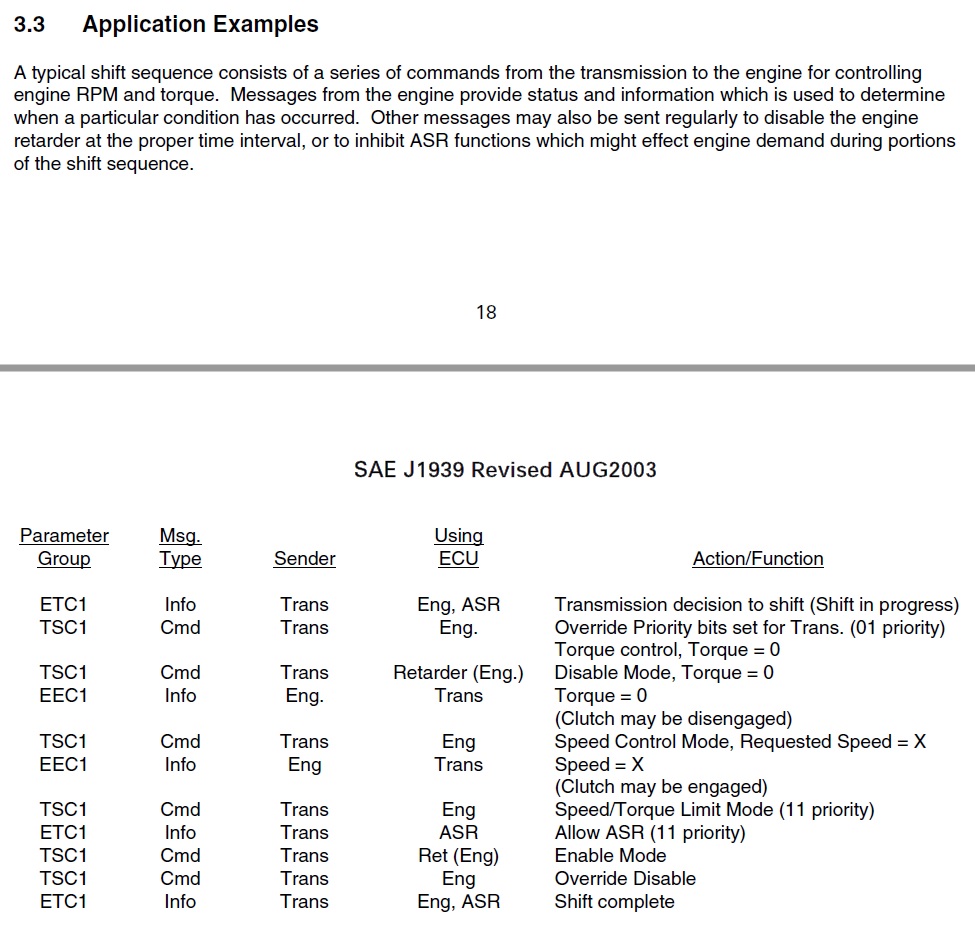 SAE J1939 is a pretty gigantic standard; its different sections are sold separately. I'll have a quick look in the afternoon to see if any of the sections we have at work happen to cover the engine-transmission interface.[This message has been edited by pmbrunelle (edited 03-24-2022).]