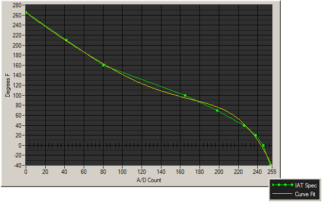 I applied the IAT sensor resistor values from the spec to the pins on the IAT connector and correlated them to A/D counts out of the ECM on the ALDL stream.