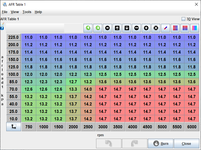 In the AFR table of my Fiero, we see that I have enriched the mixture in the lower RPM area: