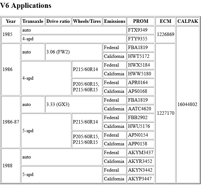 They all connect in horizontal rows, you start from the left, and pick what you have based on the options, then move right in that column to the next set of options, v6 or l4, then is it 84,5,6,7, or 88, then is it an automatic, 4 speed or 5 speed, then what size tires if applicable, then was it sold in California, or everywhere else in the US/Canada. Once you go through that, you'll have 2 numbers, the ECM number (which is the same for 86-8, hence it being less important), and the prom number (the actual chip inside the ECM that has parameters that must match the engine and transmission that you have) |