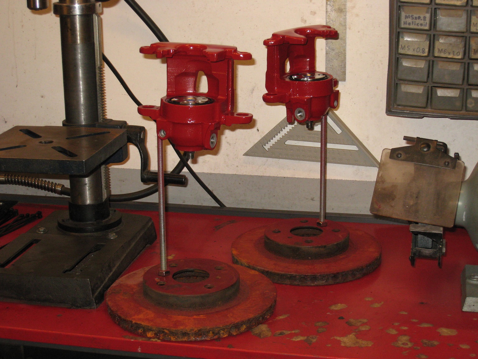 After masking the calipers, and setting them on makeshift "paint stands", I painted them with red spray-can VHT caliper paint.
