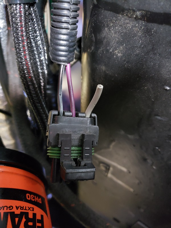 Below are photos of the plug under the car as well as the gage stuck on 5/8 while siting on the bench. One of the plug wires is cutoff and bypasses the plug. With my V8 swap, that wire powers the fuel pump and is controlled by the Holley multiport ECU. That cut off wire has been that way since the first V8 generation of this car in 1999.