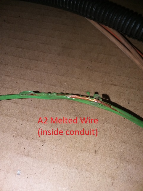 2) I traced the A2 light green wire that was melted closest to the battery and discovered several areas inside the conduit that were also melted. However, there was no collateral damage to any of the adjacent wires in any section where the Light Green wire was running, melted or not melted. This seems like a good development and if it wasn't for observation #3 I would clean and remake my harness and reinstall. This picture shows one such thoroughly melted area, but again, neighboring wires weren't melted or discolored at all.