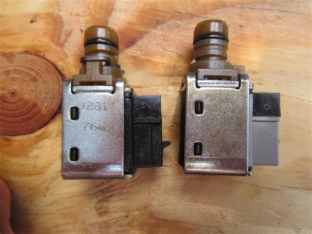 Ok, thanks. really curious to see if anything is repaired when this is done but it won't be this weekend. Turns out I got half good and half bad advice on shift solenoids. The info given was that the 2 shift solenoids were the same, but aren't. For my 2000-2001 built trans there are 2 different numbers. The 1-2 solenoid is rotated 90 degrees in the metal housing from the 3-4 solenoid to clear the channel plate. They have different plugs to differentiate them. Other than the plug everything is the same, just oriented differently. I believe the 98-99 one they might be the same since they install the same rotation. Note the tan plastic part is rotated in the pic. The electric plug colors correlate to the part number.