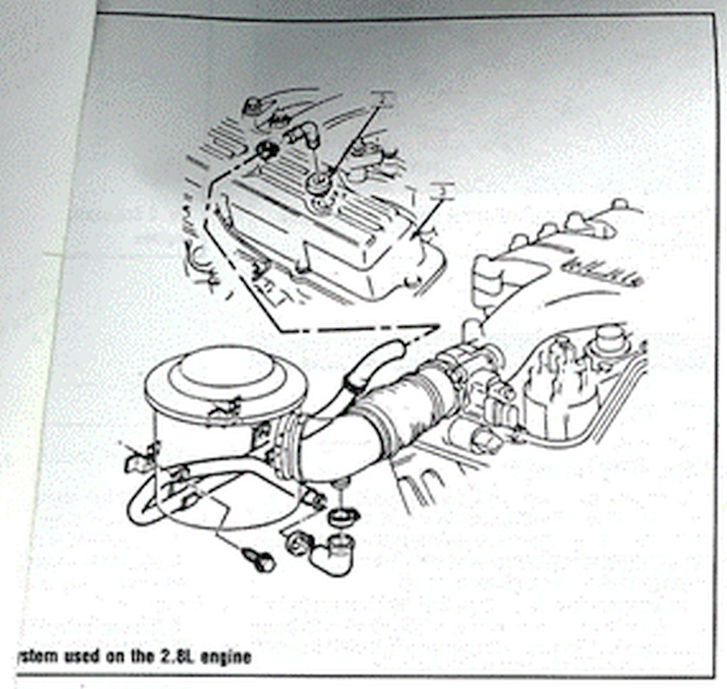 [EDIT] Curiosity has gotten the best of me, and I've come across this diagram... supposedly of a pre-recall Fiero 2.8 PCV system. I have never ever (in 22 years of being here) seen a photo (rather than an illustration) of this type of setup where the firewall tube connects to the underside of the snorkel. Very strange. My '86 GT has the firewall tube (now capped on one end) connected to the filter canister. It was never at any time attached to a snorkel. It's nowhere near where the metal tube pictured above is located. Perhaps there were two different styles of pre-recall metal firewall tubes?