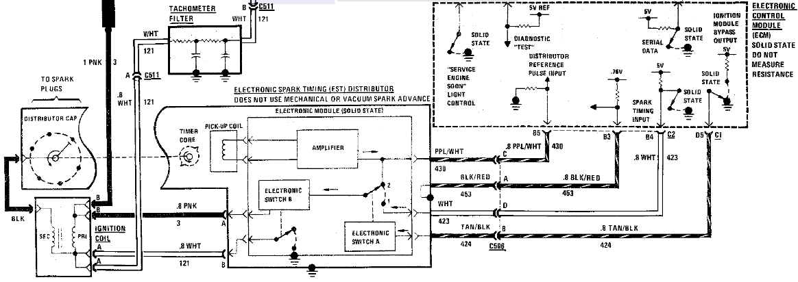 I've checked and replaced the mini harness from the coil to the ICM with no change. I've also checked and replaced the wires from the pick up coil to the ICM with no improvement. If I'm understanding the print you included correctly, putting the scope on the PPL/WHT wire should let me know if the pick up coil is working consistently.