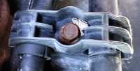 The biggest hassle was getting the car up high enough, and safe enough, for me to be working under it. I had a bit of trouble determining where the leak actually was. It was always a very slow leak, so I knew I'd have to get the coolant good and hot, and under pressure, to find it. It seemed to me that the foam covering over the heater core inlet tube under the car was damp. I figured I'd start from the front, and open up the foam with an incision down the length of the pipe... but starting with just the first six inches from where it connects to the heater core inlet rubber hose. There's a plastic bracket that holds both tubes (inlet and outlet) to the underside of the car. This is what the bracket looks like (although this one is from a different area).