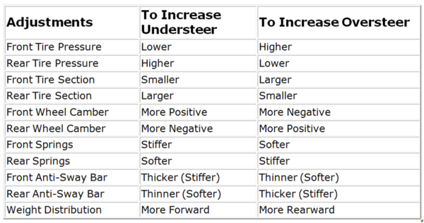 As the chart shows, tire pressure, camber, springs, anti sway bars and weight distribution all play a role in oversteer and understeer. Weight distribution is probably the most difficult to change, so is the logical choice to accept as complete as you start your suspension tuning journey. My Fiero weight distribution is 44% front, 56% rear. That is the same weight distribution that competition karts use as their baseline for suspension setup.