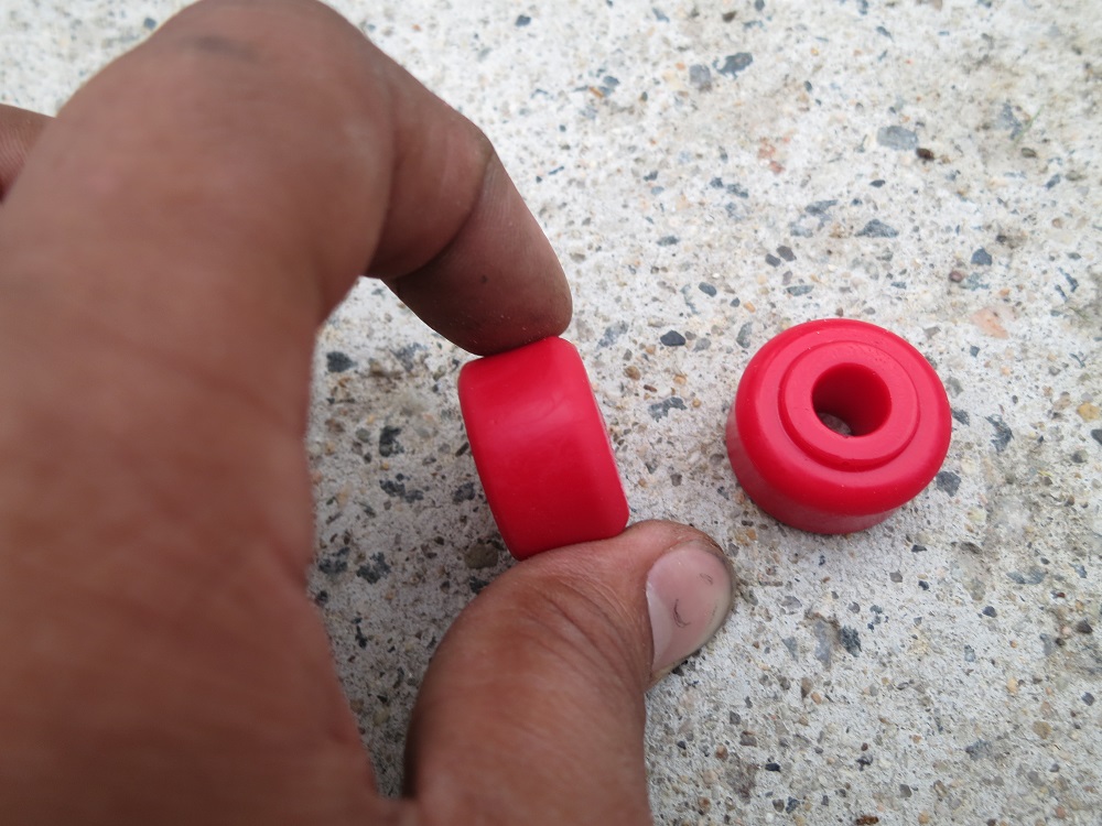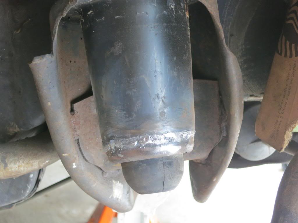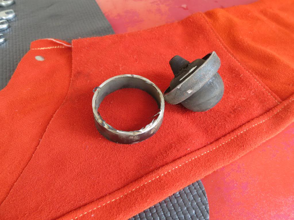 While I had the front hubs off I decided that I was sick of bottoming out all the time and cut my bump stops. I could get most of the way around with an angle grinder, but then cut the last bit with a dremel with a cutoff wheel. I put the grinding disk on the angle grinder and pressed it flat to the cone to make it nice and flat on the bottom to weld to. I cut around an inch of material from the bumpstop and welded them back up with flux core wire. I also added the cup pieces to the polyurethane bushings I had previously installed in the front suspension.