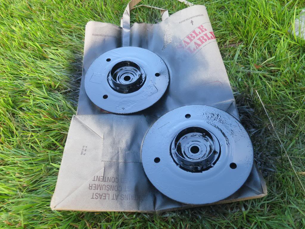 Now what I did next I had to undo, because I thought I could install the top hats upside down and get some extra travel. I didn't take pictures when I redid everything with the top hats in their regular orientation. But I tacked some 2.5 inch exhaust tubing to the top hat to center the springs. They are perfectly centered, it appears off in the picture as the paint is still wet and shiny.