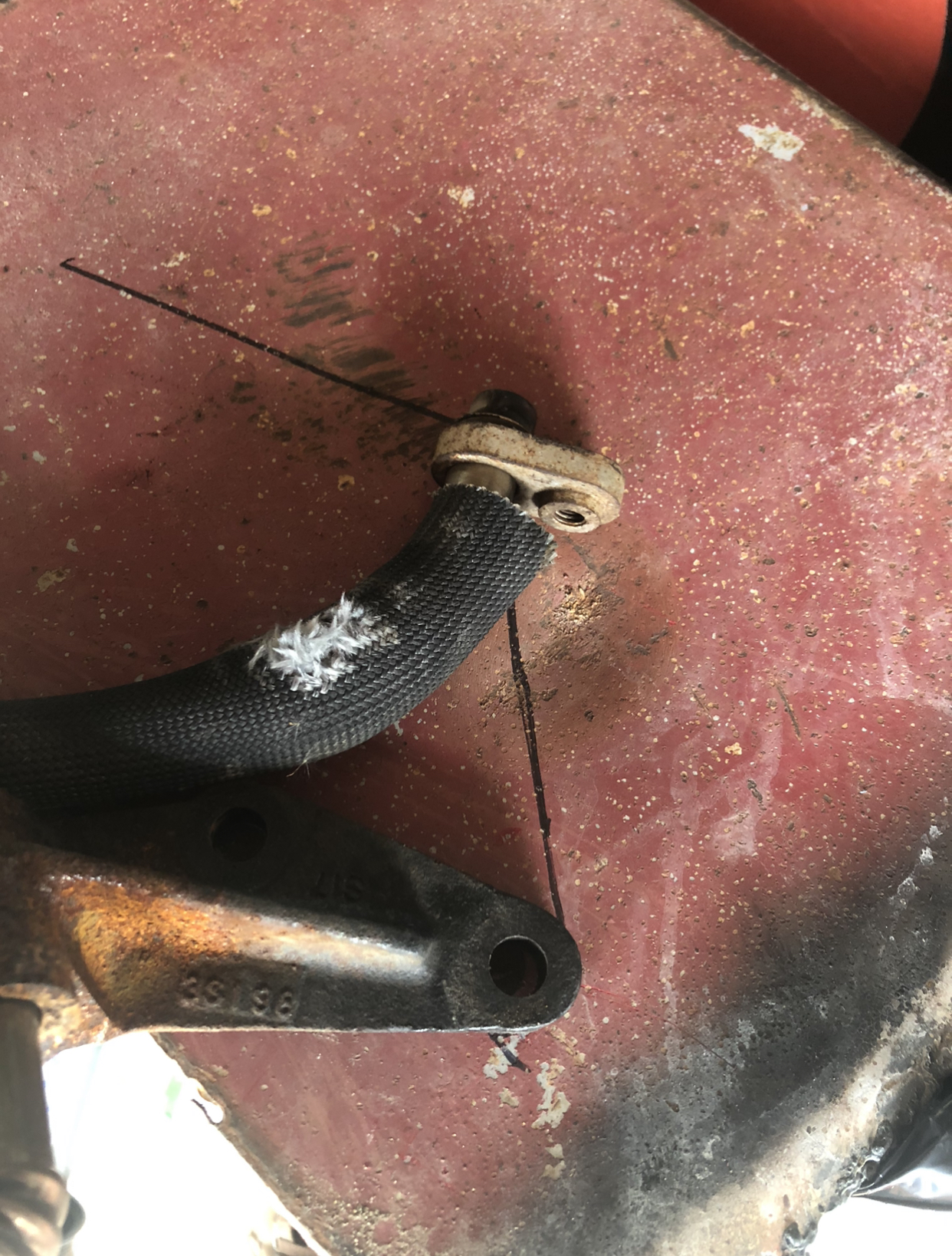 While there, I made an oops. I had to cut one of the bolts on the passenger side control arm, and I clipped the coolant tube with the cutting wheel
