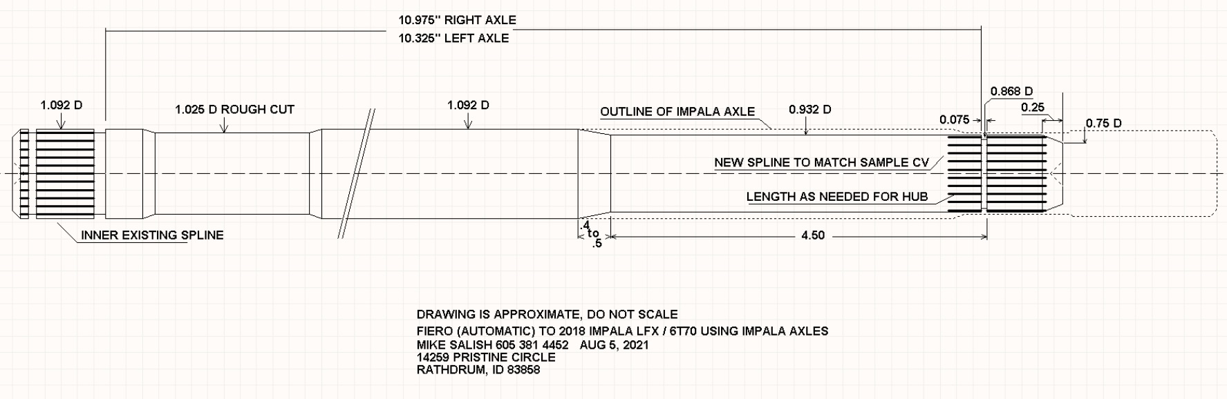 I found Dutchman Motorsports on the web in Boise, ID (https://dutchmanaxles.com) who said they could shorten, resize and respline the Impala axles for $75 each. Their big concern was that they would need to remove too much from the axles and get into the softer axle core. I sent them a drawing and they confirmed that the diameter reduction was good so I shipped the impala axles off along with a fiero axle and splined spider from a (new) Fiero outer CV as reference parts. Three weeks later they showed up and look great. For boots I went to (I'll find the name later) who specialize in CV joint parts. they had boots of the correct diameters in their catalog made fom a composite material, part rubber and plastic, for about $10 each with shipping. Since I was well into getting the engine in the car and connecting the liquid lines I set the axles aside for now.