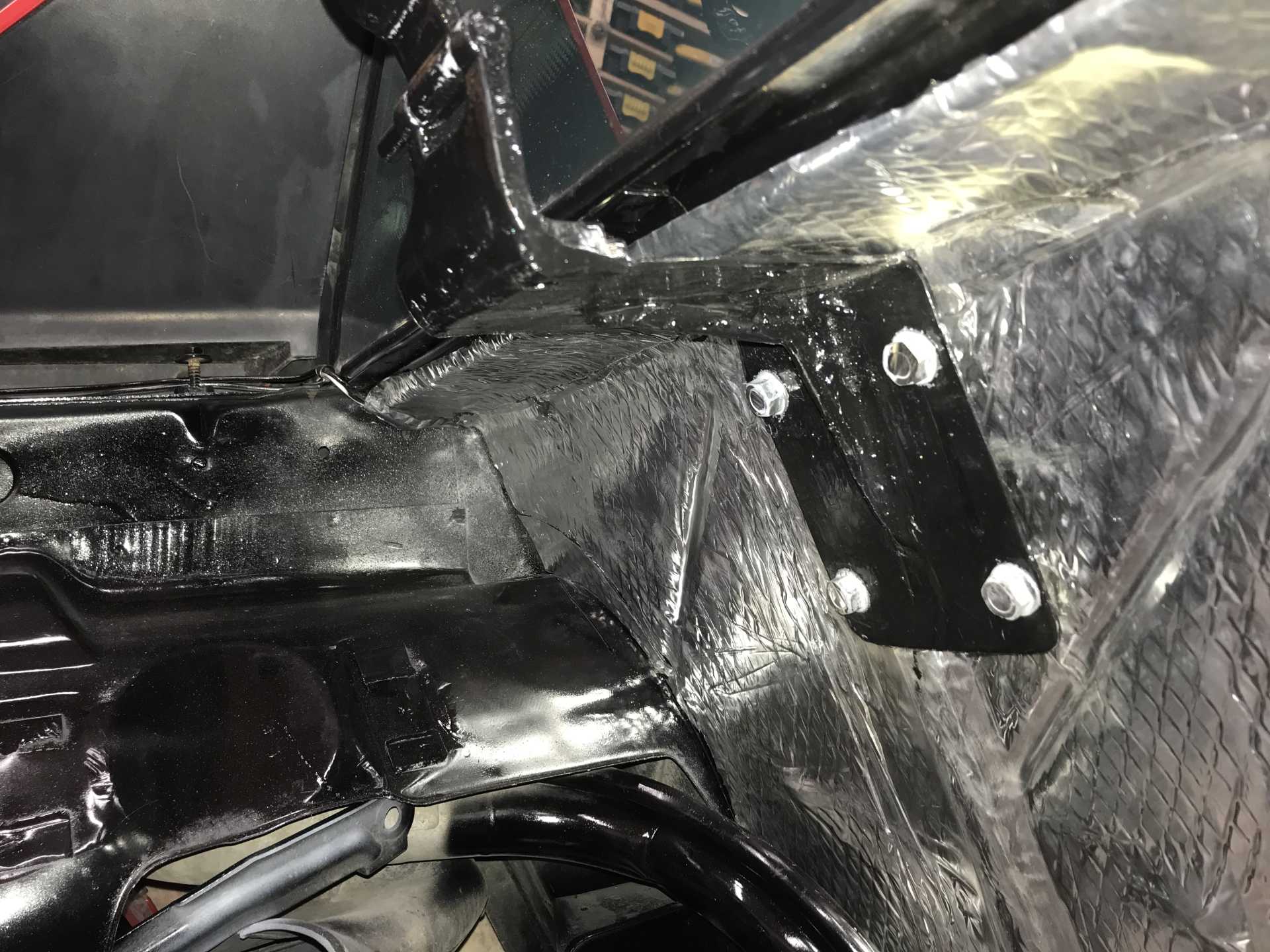 And except for one cam sensor it fits. I cut out a part of the right shock tower to clear this. Should have moved the engine left another 3/4”. Engine is 3” low and will hit the tower. Angle grinder to the rescue.