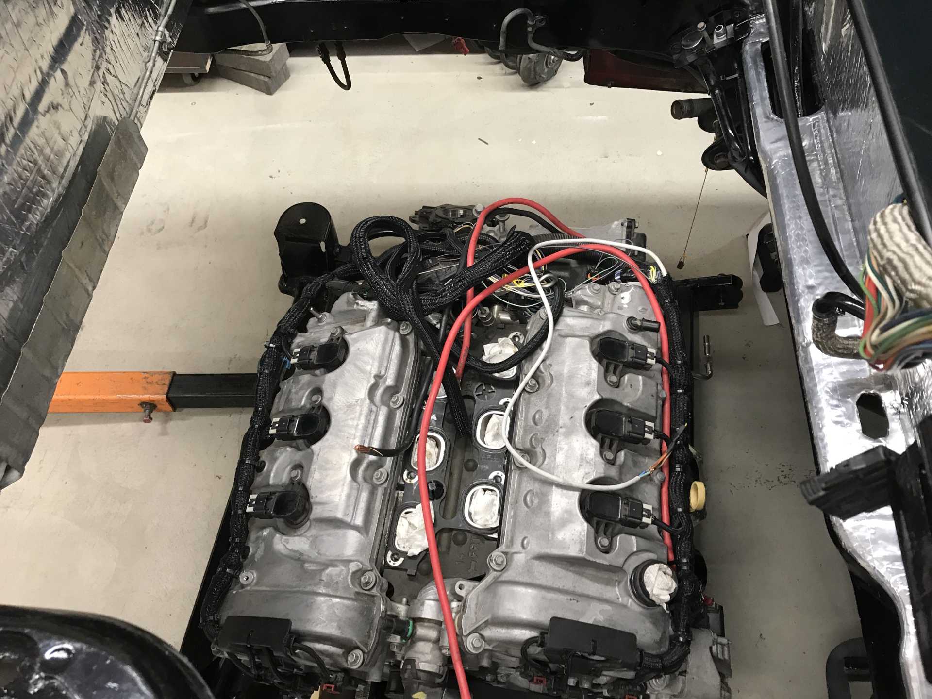 Then I spent a day or two doing things to the engine that would be more difficult after it was in place. I noticed what Daryl M did on his LFX swap and decided to provide some type of insulation for the outside of the cats. He used muffler tape but the cost of that stuff was more than I liked so I fabricated two heat shields out of 18ga steel and mounted them with modified hose clamps. I also cleaned up the engine harness and ran heavy duty cables for power and ground to the remote battery terminals. then it was time to install the engine and see if my planning paid off.