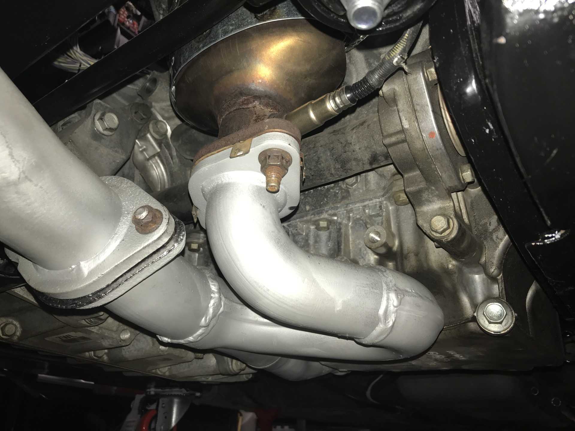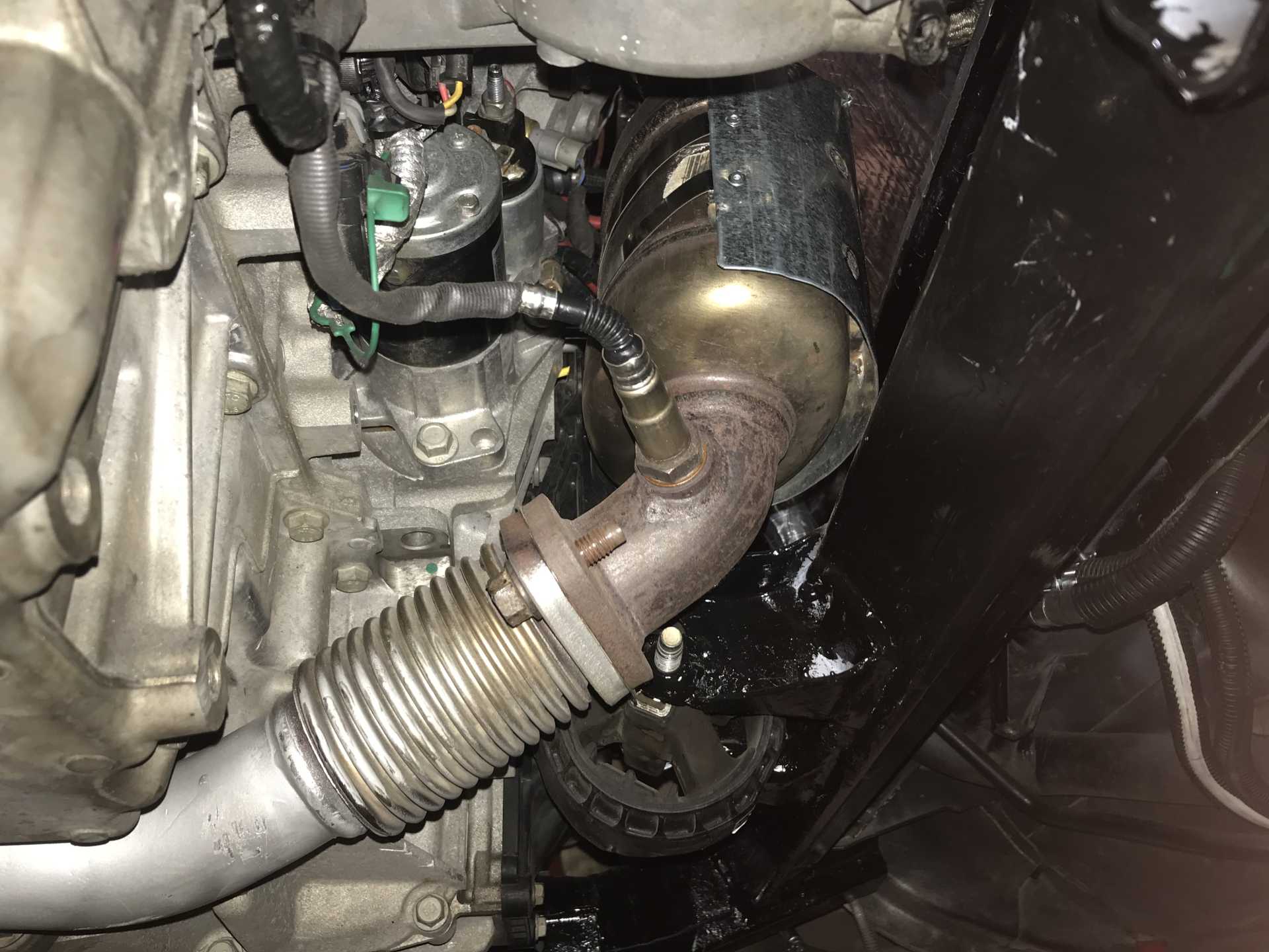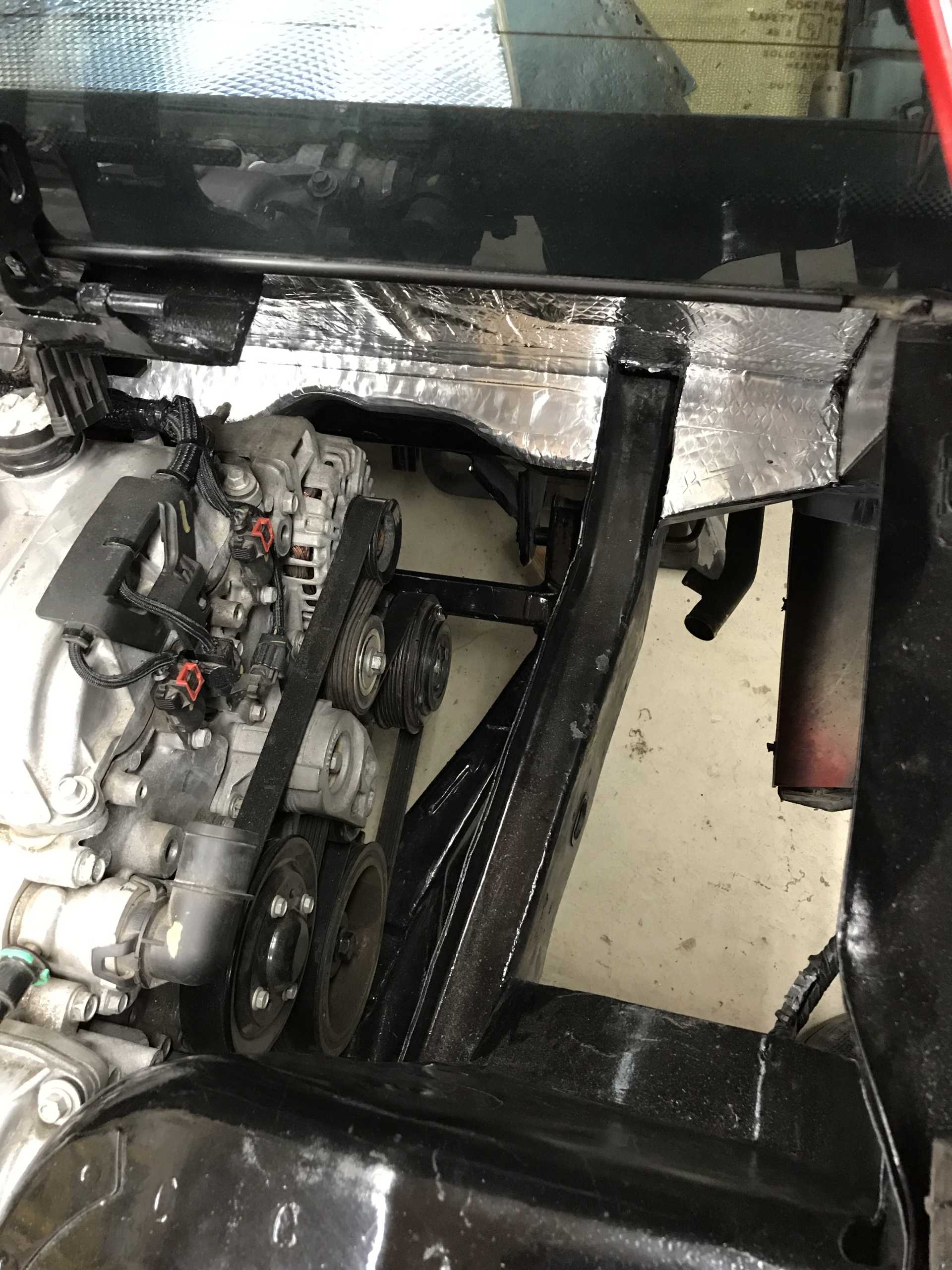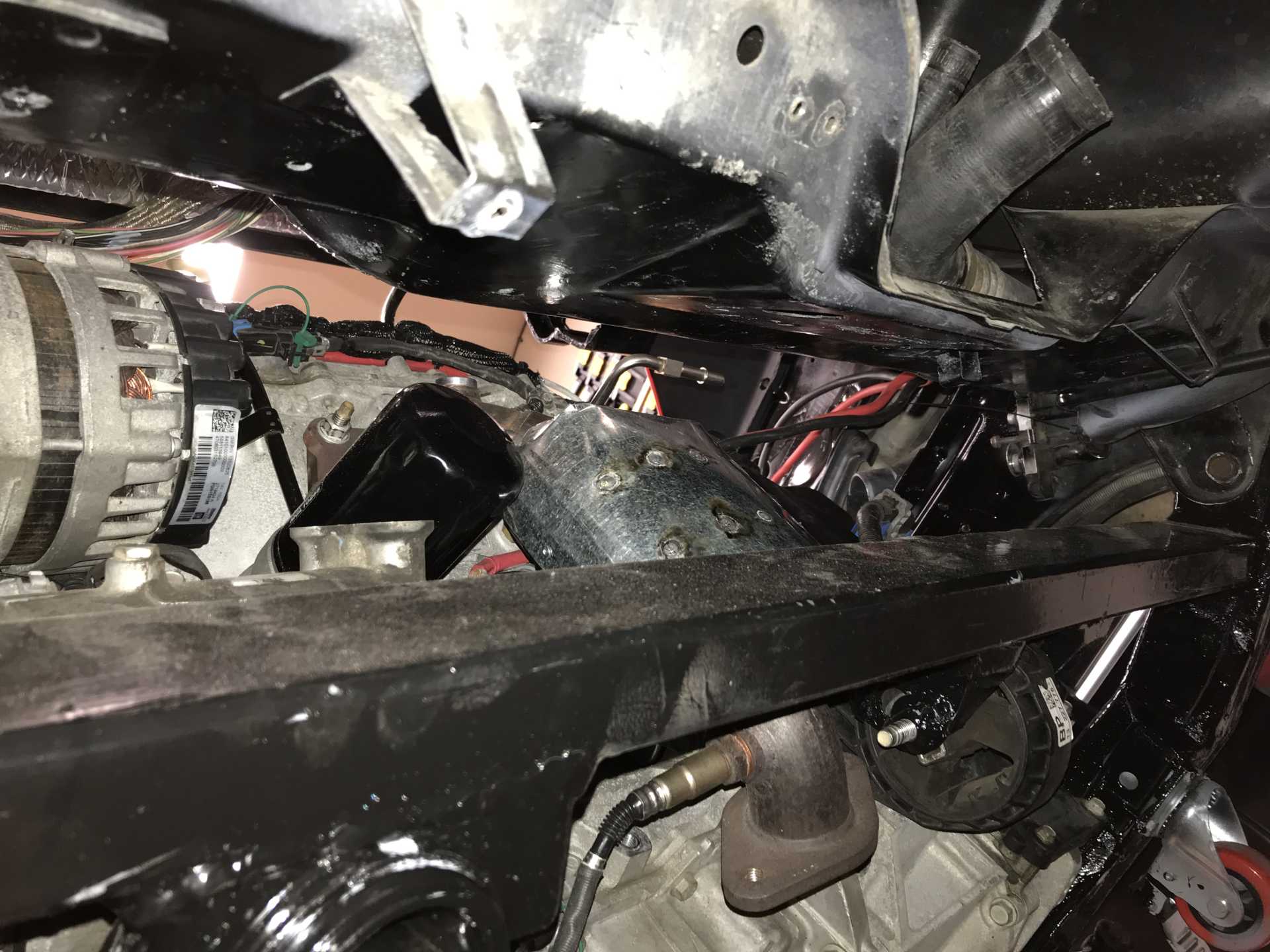 View of front of engine from the bottom, A/C is under Alt, I built heat shields for both cats. may not need the front one. Exhaust goes under the engine, has a notch in the oil pan. Those mounts are out of the Impala. There was a heat shield along all of the firewall since there were exhaust pipes, a crossover pipe and a Cat Converter. Now all gone. Cats and pipes are near nothing sensitive to heat.