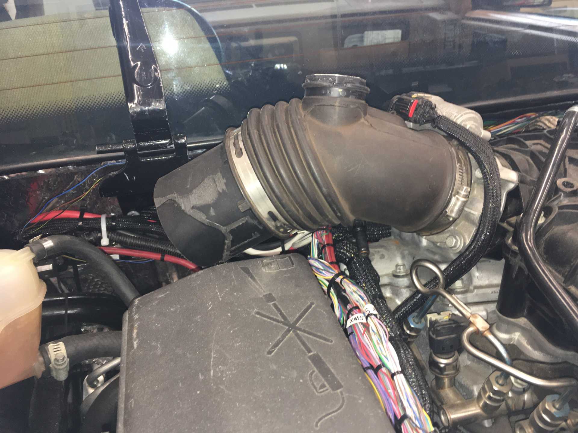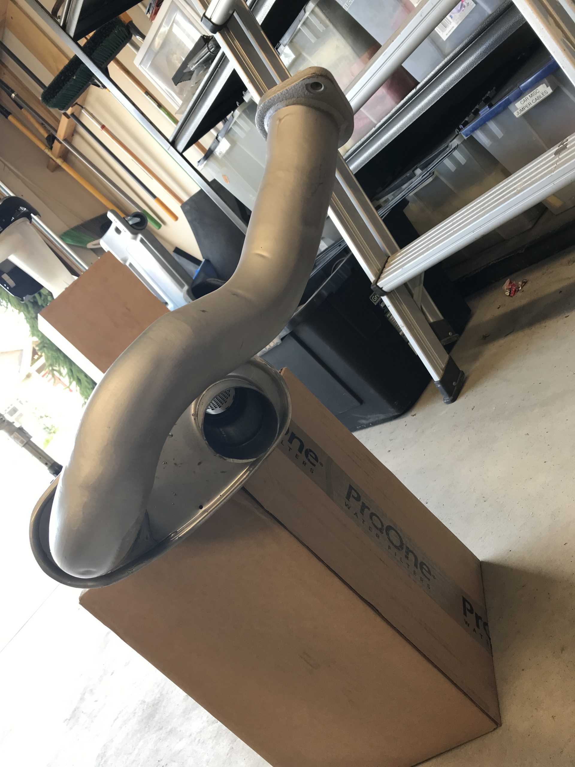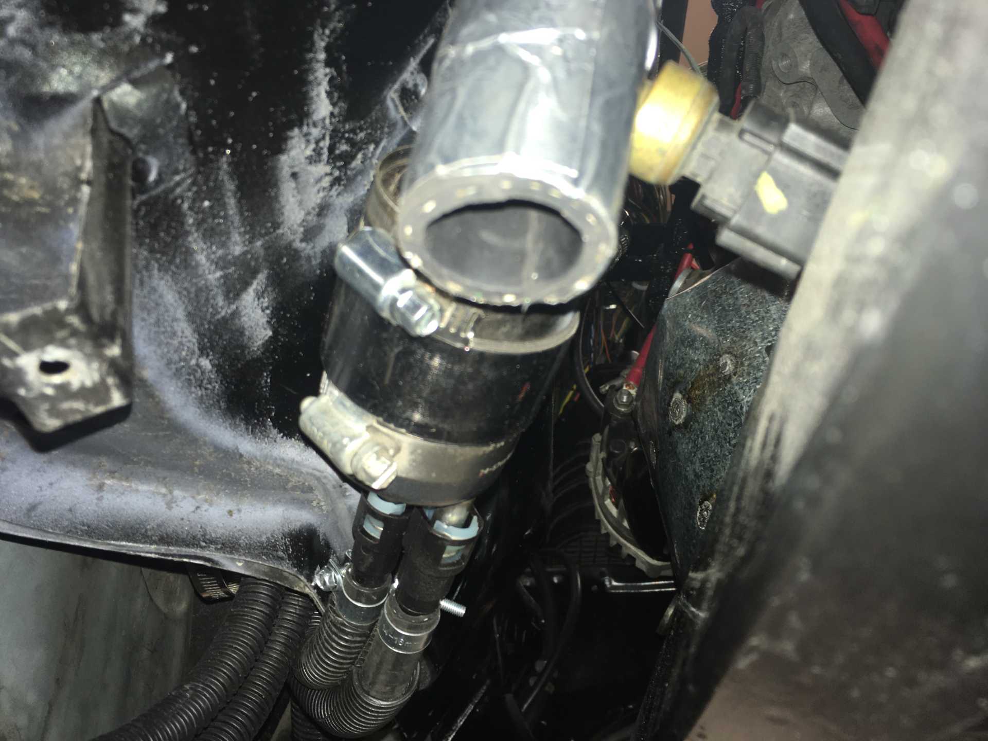 The intake tube. The cap on the side went to a resonance chamber to reduce noise. Needs to be lowered somehow.