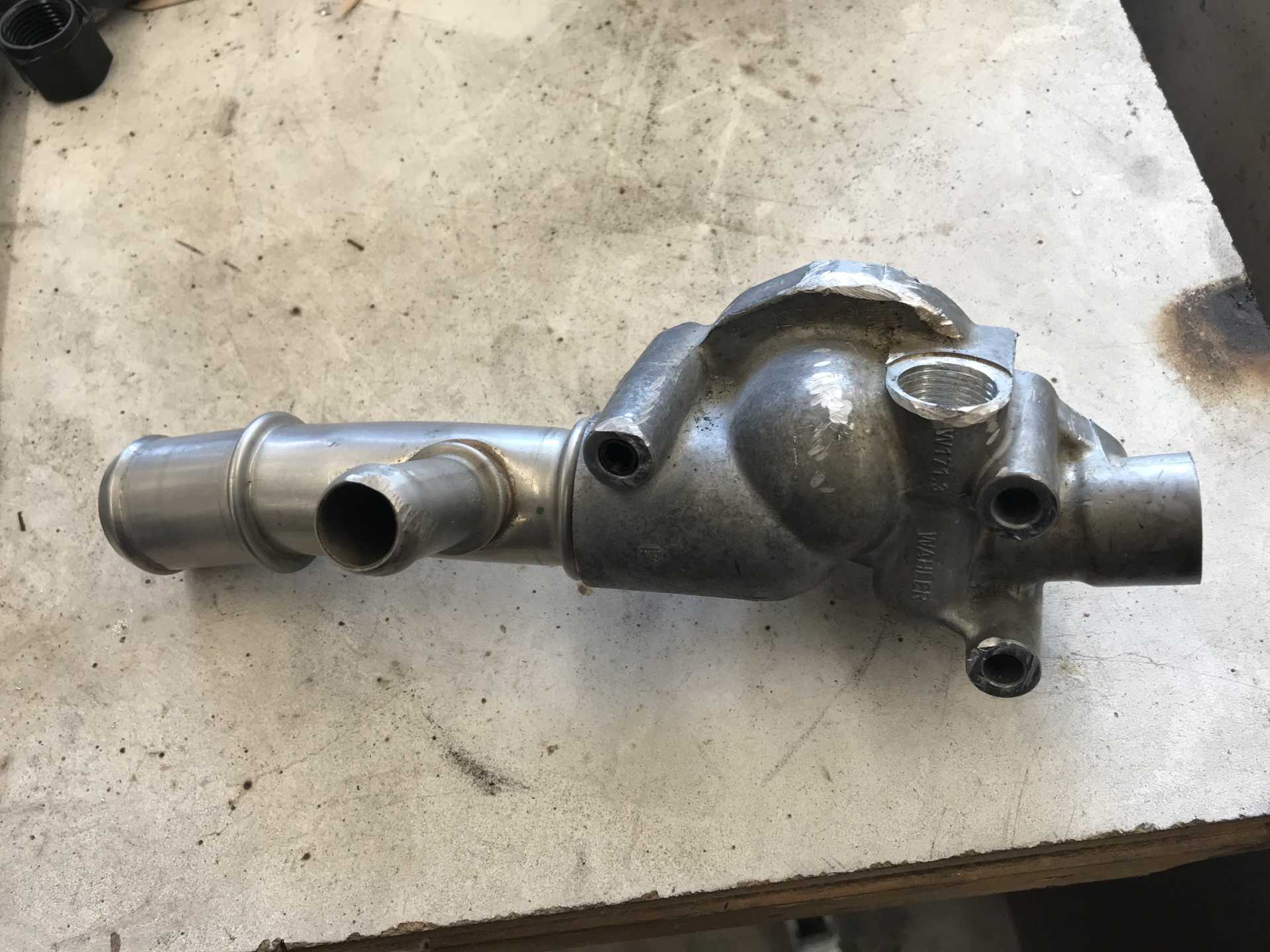 The heater hose fittings are at the top and right of the photo. The large pipe goes to the radiator, the smaller branch goes to the expansion tank.
