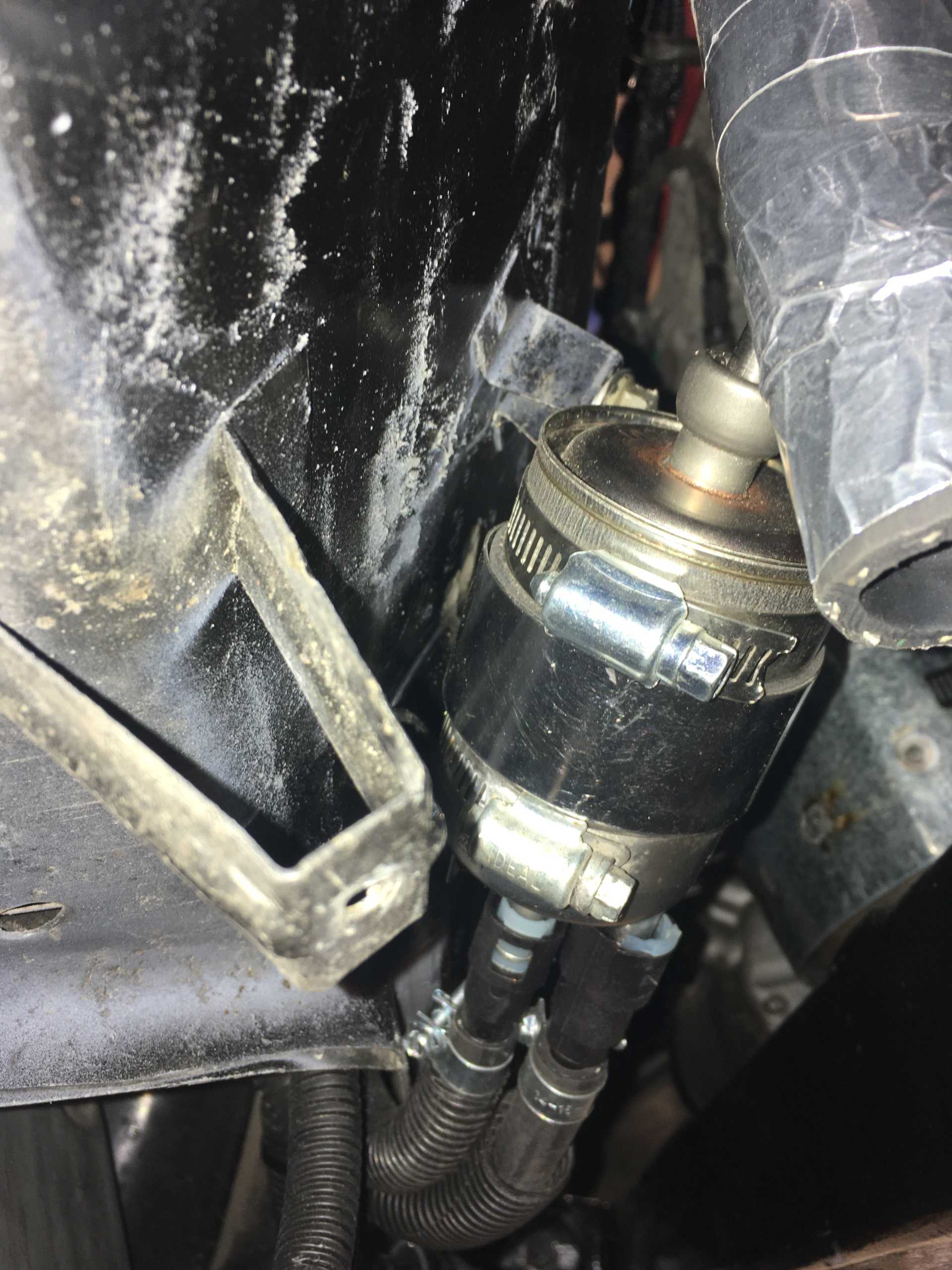 The fuel tank pipes also needed attention since the pipes for supply & return also pointed in the wrong direction. So those were also chopped off and re-beaded. The new hoses were routed well away from the cat converter and up to a Corvette fuel filter with internal regulator. The outlet then included the Impala fuel pressure sensor and ran up to the inlet of the high-pressure injector pump. That worried me since there were two hose clamps and a rubber hose in that section. If they leak or burst it could spray fuel on the cat. I ended up enclosing them all in a piece of 1" hose open on the bottom that lead down below the frame. I'll replace these with a custom metal pipe in the future.