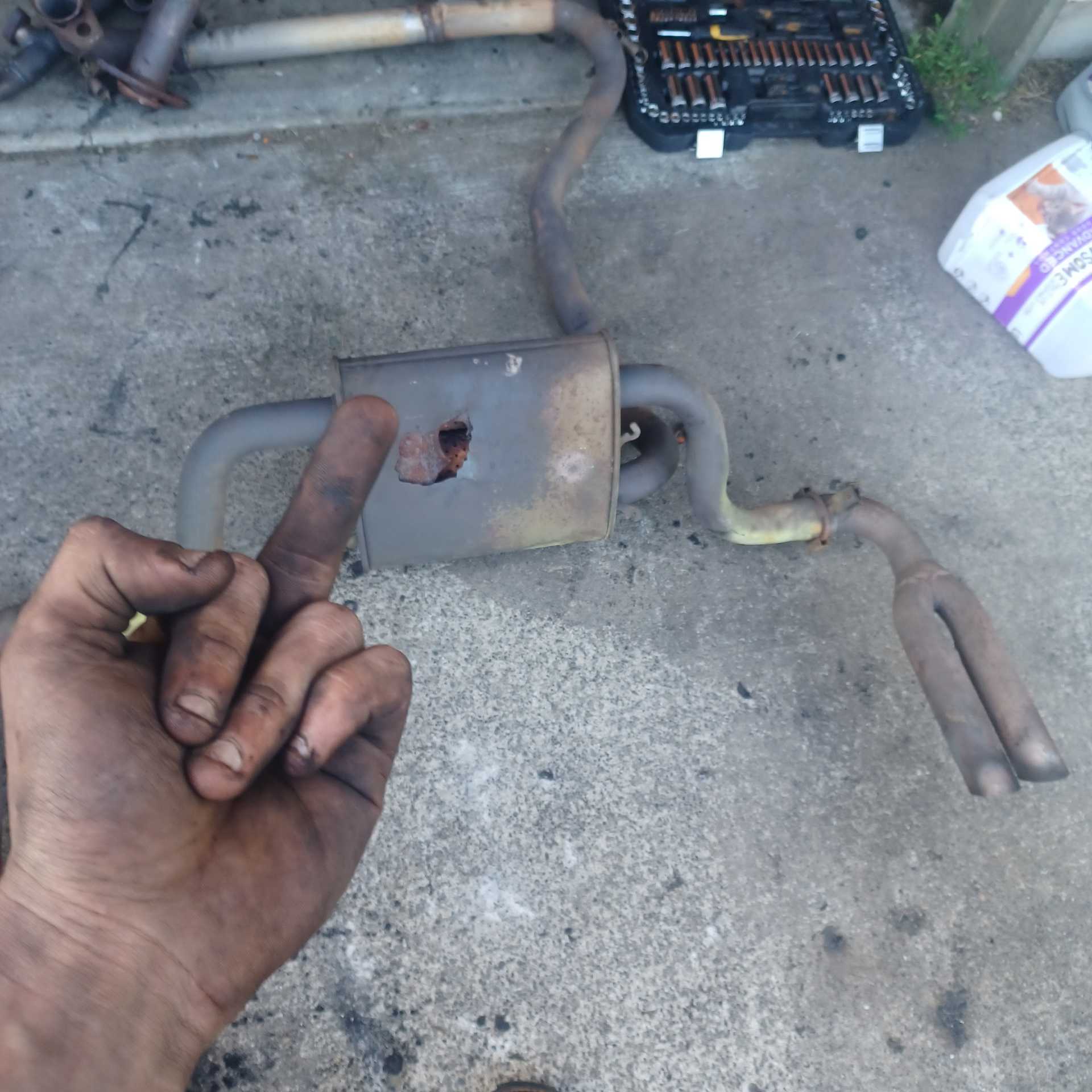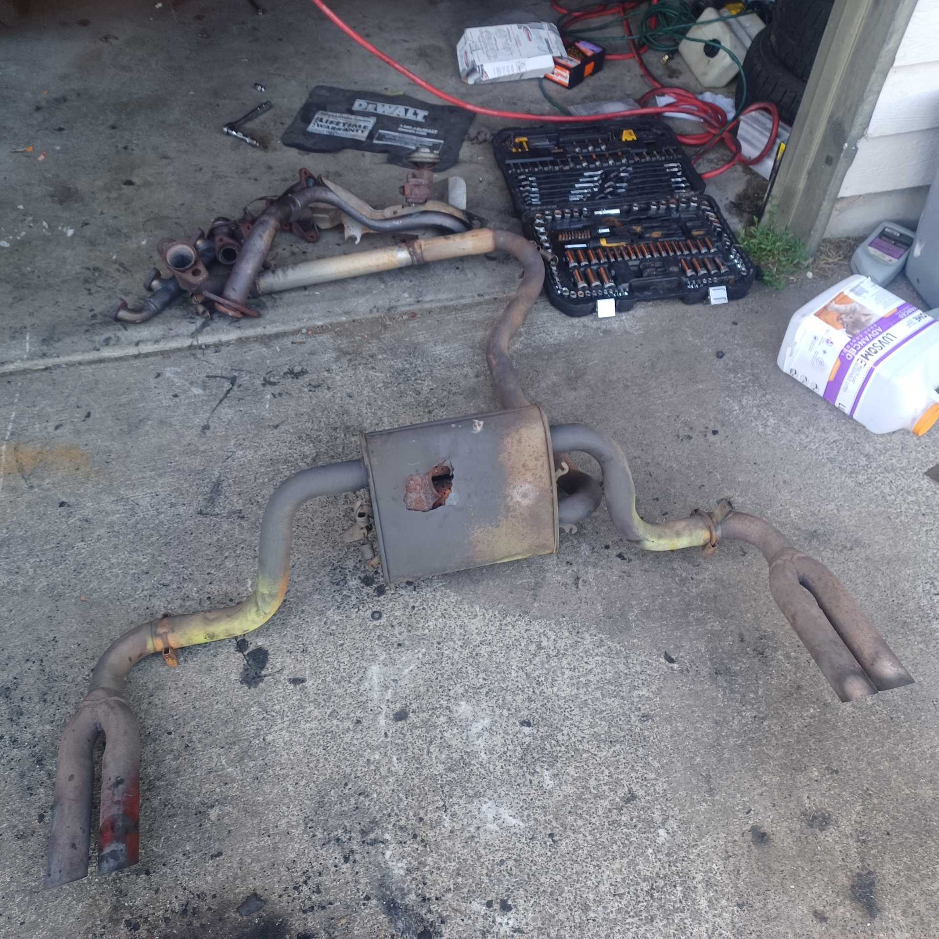 it set another code 22. also surging like a carb out of gas when held at one throttle position. more importantly I did figure how where the exhaust leak was. or rather it decided to make itself very known at 3 am last night with a hellacious backfire and some oil burning off the rear header as I guess it finally got pretty hot. got quite a few cuts and rust in my eyes and some interesting chunks of heat shield. hence the French sign language