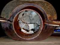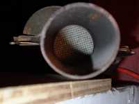 I was fortunate. The outlet end (shown below) of my broken up cat was still intact, which prevented the innards from travelling downstream into my muffler... although when the engine was revved, I could see white "dust" coming out of my exhaust tips.
