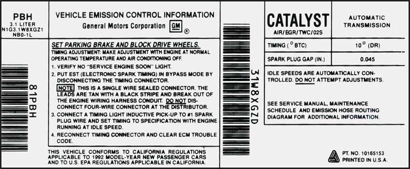 The Beretta, Corsica, Cimmaron, Pontiac 6000, Tempest, Century, Skyhawk, Firenza, Cierra, Celebrity, and Cavalier all used the 7730 ECM in 87 and 88. An emissions sticker from one of those vehicles could be used and it would properly represent the conversion. All those cars used a 2.8 V6 engine. |