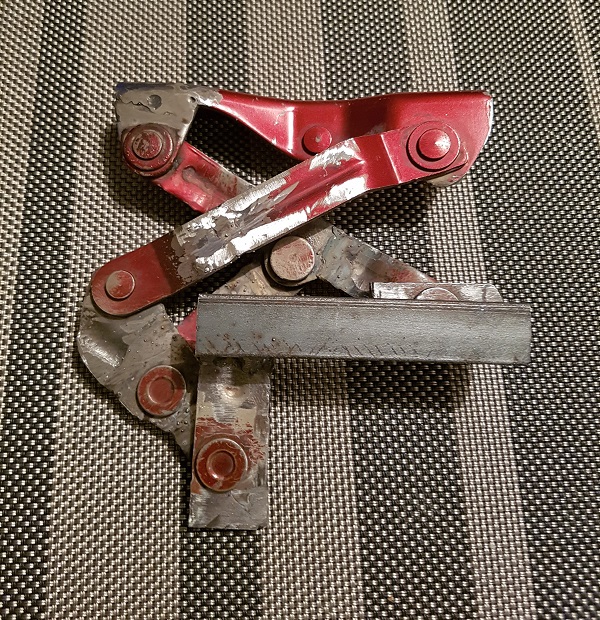 I created the hinge in a CAD program that allows simulation of mechanical systems to ensure the arm lengths and pivot locations were correct. Here is the final mechanism...just needs a little dressing (grind / sand some rough spots) and then it'll get a little black paint...