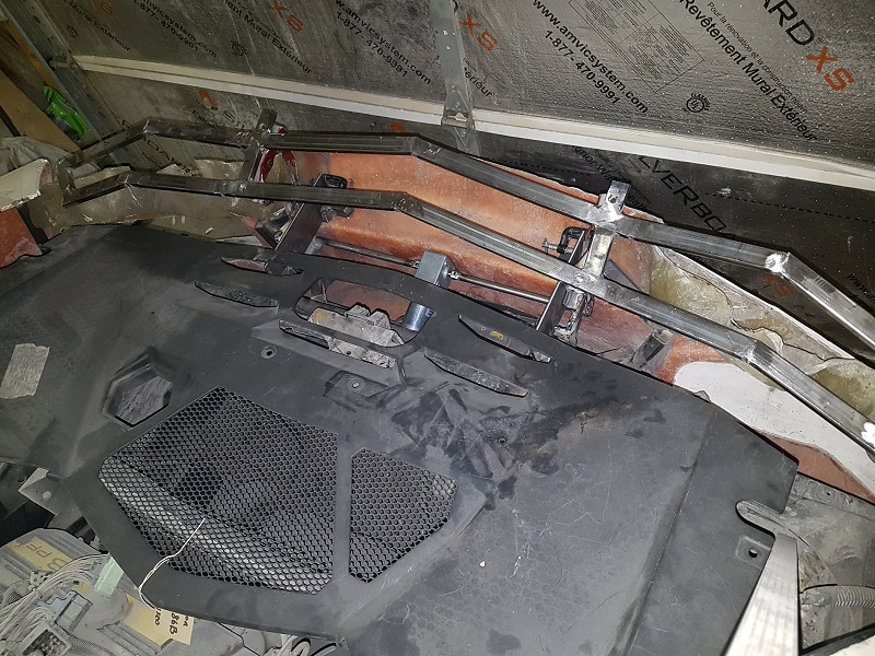 Started to put together the drive mechanism for the spoiler. It will be using a high torque, low speed geared motor. Of course I also discovered that the current framing for the bumper will be completely in the way of the drive mechanism...so, of course I'll have to make some changes to the framing. In the pics below, the spoiler framing is actually sitting about an inch and half lower than it should be. I'll set it up so that the mounting points are adjustable to allow me to easily adjust the lowest height and angle of the spoiler.